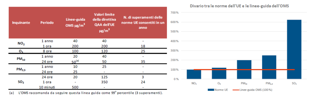 Le indicazioni dell’Organizzazione Mondiale della Sanità sull’impatto grave che gli inquinanti atmosferici esercitano sulla salute umana sono state, con il tempo, in parte recepite dalla normativa europea e nazionale. Tuttavia come illustrato dall’immagine sotto, per molti inquinanti regolamentati, rimangono e ancora lontani i limiti indicati dall’OMS rispetto a quelli previsti dalle norme europee e, in particolare, da ultimo, dalla Direttiva 2008/50, recepita nel nostro paese dal D.Lgs. n. 155/2010.