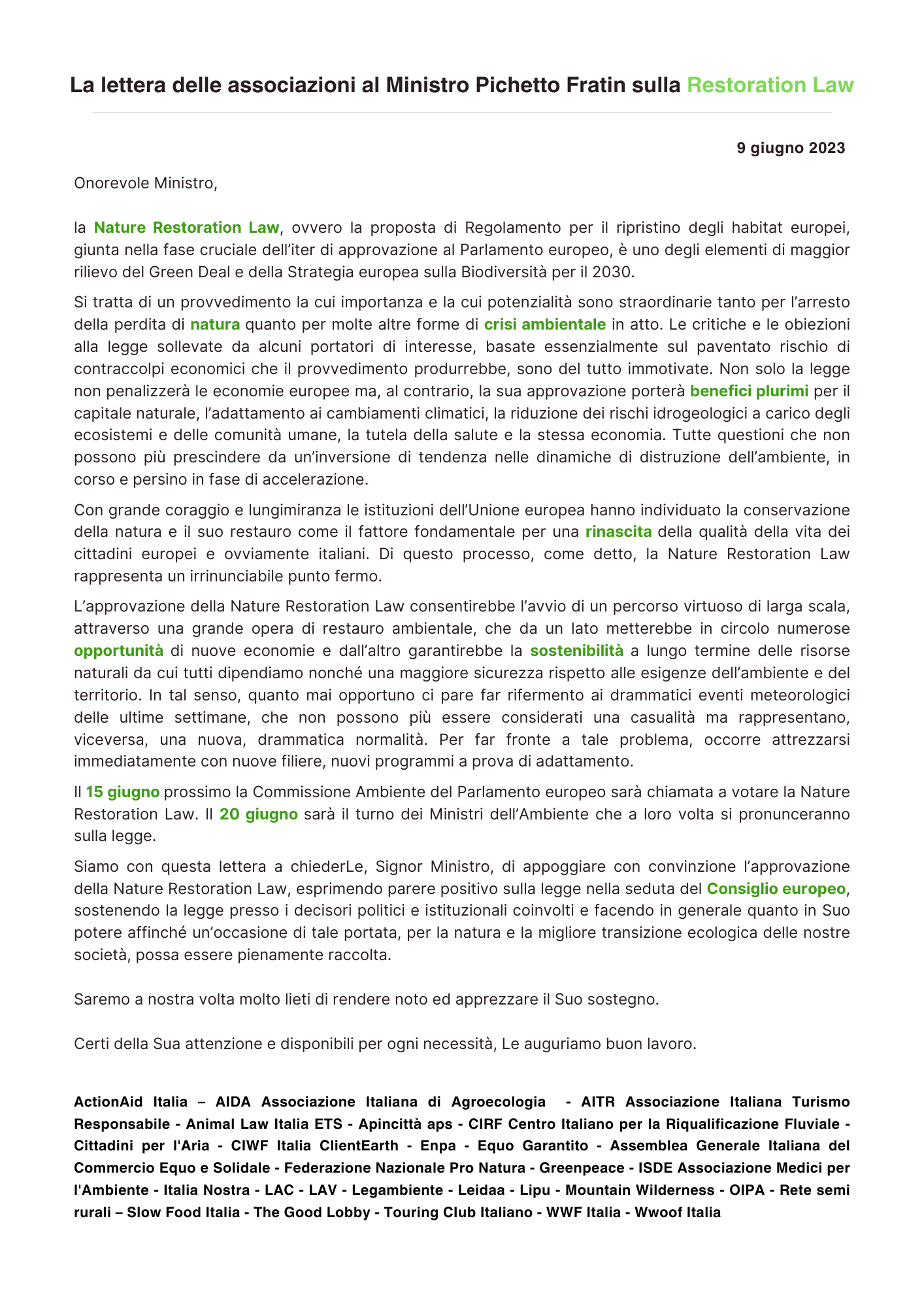 “Un appoggio convinto all’approvazione della Nature Restoration Law, il Regolamento per il ripristino degli habitat europei in votazione nelle prossime settimane al Parlamento europeo, che contribuirà ad arrestare la drammatica perdita di natura in Europa e allo stesso tempo porterà enormi benefici in molti importanti campi”.